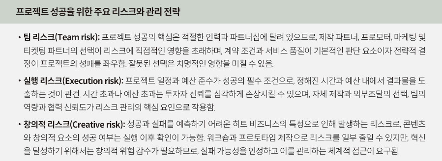 또한 투자자들에게 설득력을 높이기 위해 프로젝트의 성격과 투자 구조를 명확히 정의해야 하며, IP 기반 여부(오리지널 IP, 라이선스 기반 IP), 운영 방식(순회형, 고정형)과 같은 요소를 구체화할 필요가 있다. 이와 함께, 예산 수립, 일정 계획, 제작 과정 설계, 고객 확보 및 차별화 전략 마련과 같은 구체적인 계획을 수립해야 한다. 이를 통해 프로젝트의 경쟁력을 투자자들에게 설득력 있게 전달하고, 성공적인 실행을 위한 기반을 제공할 수 있다.