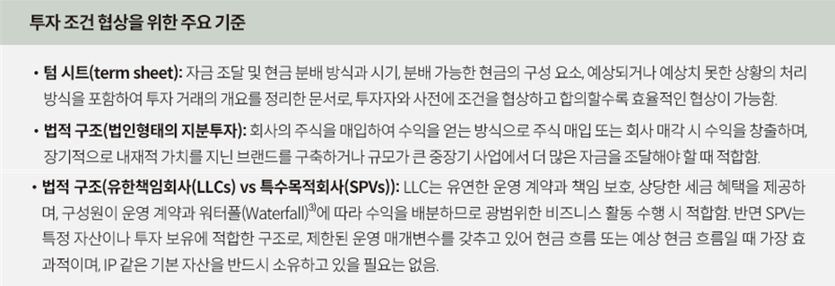 명확한 조건 설정은 양측이 각자의 역할과 책임을 분명히 이해하고, 프로젝트의 안정성과 수익성을 확보할 수 있는 토대를 제공한다. 특히 최종 계약의 구조는 투자자의 기대와 프로젝트의 목표를 조화롭게 반영하며, 장기적으로 성공적인 파트너십을 이끄는 중요한 요소다.