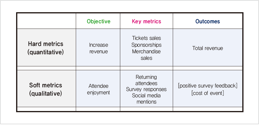 이벤트브라이트(Eventbrite)는 체계적인 ROI 측정을 위한 명확한 템플릿을 제공한다. 목표, 주요 지표, 결과라는 세가지 핵심 축을 중심으로 구성된 이 템플릿은 하드 지표와 소프트 지표를 균형있게 다룬다. 하드 지표로는 수익 증가, 티켓 판매, 스폰서십, 상품 판매 등이 포함되며, 소프트 지표로는 참석자 만족도, 재방문율, 설문 조사 응답, 소셜 미디어 언급 등을 측정한다. ‘ROI = 총 판매 수익 / 총 이벤트 비용’이라는 명확한 계산 공식을 제시하여, 주최자들이 행사 계획 단계에서부터 목표 ROI를 설정하고 추적할 수 있게 한다.