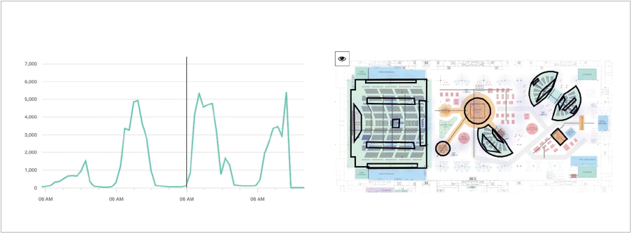 ▲ 실시간 체크인 그래프(좌) 및 히트맵 변화(우) 화면 예시(자료: Bizzabo)