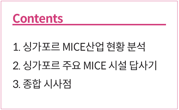 실제로 방문한 싱가포르 MICE산업의 분위기는 다시금 활기를 찾은 시장을 맞이하며 매우 분주한 모습이었다. 본 고에서는 재도약을 앞두고 있는 싱가포르 MICE산업의 현황과 현장 모습을 조망하며 글로벌 MICE산업의 발전 방향을 조망해보고자 한다.