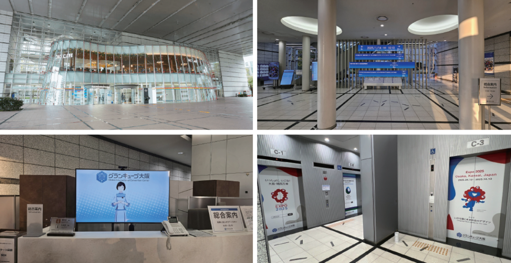 오사카국제컨벤션센터(OICC)의 1층에 들어서면 독특한 우주선 모티프의 현대적인 디자인이 눈길을 끈다. 입구에는 그날 개최되는 모든 행사를 한눈에 확인할 수 있는 대형 전광판이 설치되어 있어, 방문객들이 효율적으로 행사 정보를 확인할 수 있다.