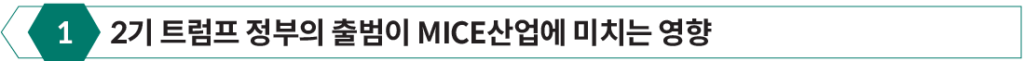 또한, 트럼프 정부의 기조를 따라 연방 정부의 채용 동결이 지속될 경우 여권 및 비자 처리 인력이 부족해지고, 국제 참가자들이 행사 참석을 위해 필요한 행정 절차가 더욱 지연될 가능성이 있다. 여기에 더해, 무역 보호주의 기조가 강화된다면 MICE 행사에 필요한 장비와 물품의 수입 비용이 증가할 수 있으며, 이는 행사 운영비 상승으로 이어질 것이다.이와 함께, 트럼프 행정부의 기후 및 환경 정책 변화도 MICE산업에 영향을 미칠 것으로 보인다. 트럼프 대통령은 재선 공약으로 파리 기후변화협정(Paris Agreement, 2015)을 다시 탈퇴하고 핵에너지 생산 증대 및 전기 자동차에 대한 의무 규정을 재평가하겠다고 발표한 바 있다. 첫 번째 임기에서 환경 규제를 완화했던 것처럼, 취임 첫날 파리 기후변화협정에 탈퇴하는 행정명령에 서명하는 것으로 임기를 시작했다. 이러한 세계 흐름에 따라 세계 도처에서 우려의 목소리가 거세다. 트럼프의 파리협정 탈퇴는 2017년 첫 발표 이후에도 미국 내의 많은 주(州)들과 기업들은 트럼프의 결정에 반대하는 목소리가 작지 않았다. 애플(Apple), 아마존(Amazon), 구글(Google), 마이크로소프트(Microsoft), 페이스북(Facebook)과 같은 미국 내 많은 기업들은 이러한 행보에 반대의사를 표명하며 “우리는 여전히 지키고 있다(We Are StillIn)”이라는 이니셔티브를 출범하고 파리협약 지지를 선언하였다. 미국의 3대 석탄기업인 클라우드 피크 에너지(Cloud Peak Energy)를 비롯한 주요 석탄기업은 기후변화 회담을 활용해 국제사회가 반(反) 화석연료 정책 및 조치를 취하지 않도록 할 수 있을 것이라며, 트럼프 대통령에게 파리협정 참여를 유지해 달라고 요청한 바 있다. 특히 지난 캘리포니아 산불 피해로 기후로 인한 재난에 민감성이 높아진 이때 이러한 정책은 글로벌 MICE산업의 친환경 흐름과 대조를 이루며, 주요 행사 주최자들의 개최지 선택에 변수를 제공할 수 있다.