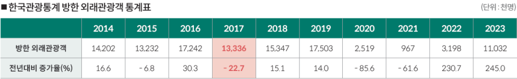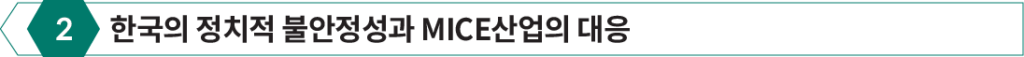 최근의 상황은 과거 국내의 정치적 불안정성과 외교적 갈등으로 관광산업이 크게 직격탄을 맞았던 2017년을 떠올리게 한다. 탄핵 정국과 사드(THAAD) 배치 논란, 그리고 북한의 핵 위협이 겹치면서 당시 방한 외국인 관광객 수는 전년 대비 22.7% 감소하였고 관광·MICE산업에 막대한 경제적 손실을 초래했다.특히 사드 배치로 인한 중국과의 외교 갈등은 중국 정부의 단체 관광 금지 조치로 이어졌으며, 이는 한국의 최대 방한 관광 시장인 중국에서의 관광객 급감으로 직결되었다. 그 결과, 다수의 국제 행사가 중국 참가자들의 불참으로 규모가 축소되거나 연기되는 등 직접적인 영향을 받았다. 또한, 북한의 핵 위협으로 인한 한반도 긴장은 국제 사회에서 한국의 안전성에 대한 우려를 증대시켜, MICE 개최지로서의 신뢰도를 일시적으로 저하시켰다.