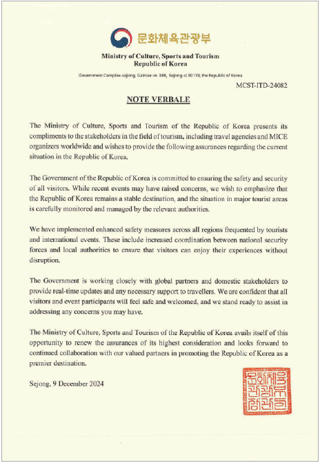 한국은 오랫동안 세계에서 가장 안전한 여행지 중 하나로 평가받아 왔다. 높은 사회적 질서와 안정된 치안은 한국 MICE산업의 주요 강점으로 작용했으며, 이는 외국인 참가자들이 한국을 국제적 MICE 목적지로 신뢰하는 중요한 요인이었다. 그러나 2024년 말, 정치적 이슈로 인해 미국, 영국, 일본 등 주요 국가들이 자국민들에게 한국 방문 자제를 권고하면서, 이러한 신뢰에 균열이 발생했다. 특히, 안전과 치안이 최대 강점으로 여겨졌던 한국에 대해 전쟁 중인 이스라엘조차 여행 경보를 발령한 상황은 MICE 업계와 관광산업 전반에 큰 타격을 주었다. 이에 문화체육관광부는 MICE 및 관광산업 관계자들에게 한국은 여전히 안전한 MICE 목적지임을 밝히는 영문 서한을 게시하고, 관광·MICE 분야의 일일동향을 파악하는 등 업계 피해 최소화를 위해 힘쓰고 있으나, 아직 전세계의 한국 방문에 대한 불안감은 쉽게 사리지지 않고 있는 상황이다.