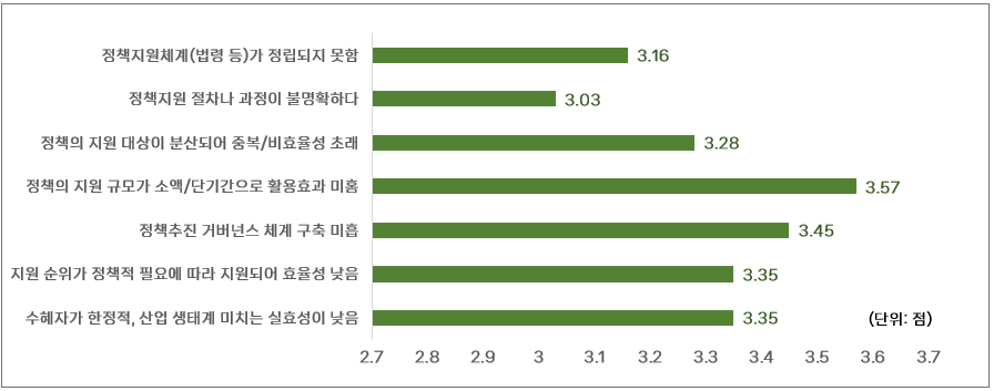 나아가 이러한 정책 수립 과정에서 산업 전문가와의 협의와 데이터 기반의 의사결정이 필수적이다. 정부 주도, 혹은 기업 분야별로 구분을 지을 것이 아니라 기업과 정부, 지역사회까지 모두 아우르는 정책추진 거버넌스의 필요성이 지속적으로 대두되는 것에 반해 여전히 마련되고 있지 않다. 정부 역시 MICE산업 육성을 위해 다각적으로 정책을 발굴하고 지원하는 노력을 하고 있지만, 정책 지원이 산업 생태계 전반에 미치는 실효성 등의 문제점에 대한 인식이 업계에서 높게 나타나며 정부와 산업계의 인식 차이가 발생하고 있는 것으로 나타나고 있다.