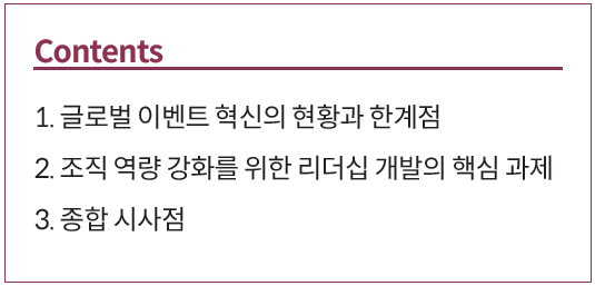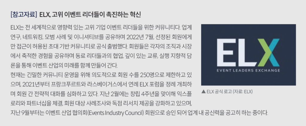 지난 10월, ELX와 Explori가 발표한 공동 연구 보고서는 현재 글로벌 이벤트 리더들이 직면한 핵심 과제를 진단하고, 이를 극복하기 위한 구체적이고 실행 가능한 전략적 로드맵을 제시하고 있다. 이에, 본 고에서는 해당 보고서를 기반으로 이벤트 물류와 리더십 혁신 간의 상호작용을 다각도로 조명하고, 더 나아가 국내 MICE산업 리더들이 글로벌 흐름 속에서 구축해야 할 전략적 리더십과 조직 역량 개발의 우선순위를 제안하고자 한다.
