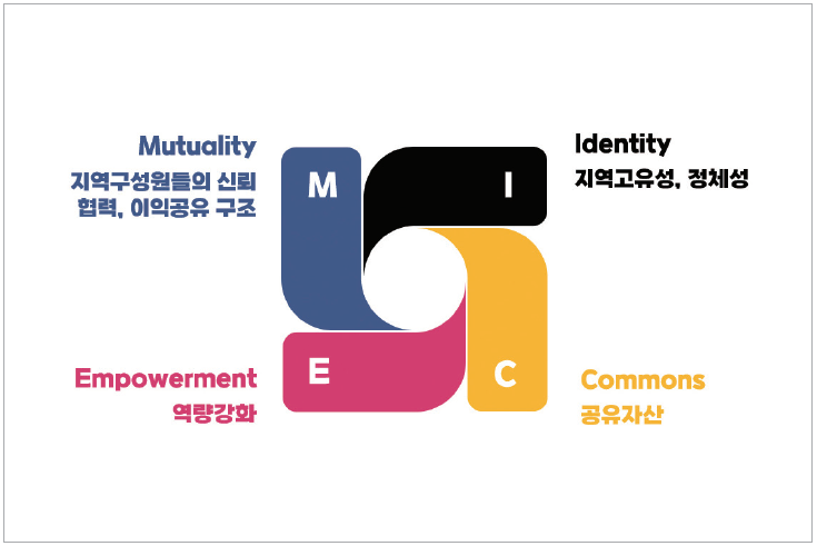 타운MICE에서의 연결은 단순한 나열이 아닙니다. 공동의 목표를 기반으로 수익을 창출하고, 이를 통해 지역이 생존의 단계를 넘어 성장의 영역으로 나아가는 데 있어 결정적인 역할을 할 수 있습니다. 그래서 기존의 MICE가 Meeting, Incentive travel, Convention, Exhibition(Event)의 약자였다면, 타운MICE의 MICE는 Mutuality(지역구성원들의 신뢰와 협력, 이익공유구조), Identity(지역의 고유한 정체성), Commons(공유자산), Empowerment(지역 역량강화)라고 정의할 수 있어요.