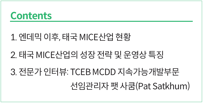 이러한 맥락에서 태국의 MICE산업은 주목할 만한 반등을 기대하고 있다. 2022년부터 본격적인 회복세를 보이기 시작한 태국은 MICE 데스티네이션으로서 역대 최고의 성과를 목표로 정부기관 및 지역사회와 더욱 긴밀하게 소통하는 중이다. 특히 코로나19 당시 추진했던 팬데믹 대응과 내수시장 활성화 전략에 이어 올해는 글로벌 시장에서의 영향력 확대를 목표로 세우고 민관산학 협력에 기반한 총력을 기울이고 있다.