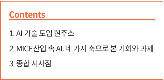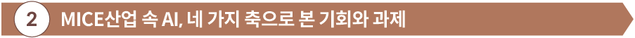 동시에 코로나19 팬데믹 이후 오프라인의 현장성과 온라인 플랫폼이 공존하는 하이브리드 생태계가 자리 잡으면서 원활한 현장 운영을 위해 디지털 기반의 온·오프라인 연결성을 강화하는 것이 필수 과제로 부상하고 있다. 동시에 특정 산업군 내부에 국한되지 않고 다양한 이해관계자가 교차하는 MICE산업의 속성상, AI 기술의 도입은 단순한 개인이나 기업 단위의 효율화 수준을 넘어선다. 이에, AI가 산업 간 협업을 촉진하고 데이터 공유를 가능케 하는 전략적 수단으로서 기능하고 있다.