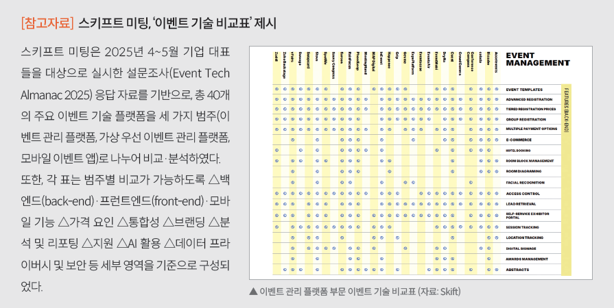 락까지 확보해 단순 만남을 성과로 이어갈 수 있다. 이러한 기술들은 단편화된 데이터를 통합된 인텔리전스로 변환하고, 이벤트 데이터를 실행 가능한 통찰력으로 전환하는 성과 가시화를 통해 이벤트 운영의 패러다임을 바꾸고 있다.