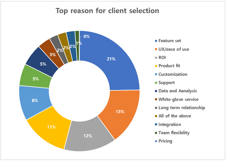 실제 기술 선택 기준을 보면 변화는 더욱 분명하다. 기능 세팅(21%), 사용자 경험 및 사용 편의성(13%), ROI(12%), 제품 적합성(11%) 등 성과와 경험 중심 요인들이 상위에 올랐으며, 가격을 핵심 기준으로 언급한 벤더는 단 한 곳에 불과했다. 이는 공급업체가 생각하는 것보다 고객이 가격에 덜 민감하고, 성과를 더욱 중시한다는 사실을 보여준다.
