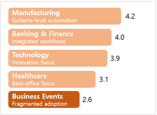 단, AI의 급속한 발전 속 MICE산업의 특수한 조건과 한계도 드러났다. 인재 솔루션 플랫폼 사운딩스(Soundings)는 ‘비즈니스 이벤트 인력 역학에 미치는 AI의 영향(AI Impact on Workforce Dynamics in Business Events)’ 조사를 통해 주요 산업별 AI 도입 수준과 시장의 기술 활용 성숙도를 분석했다. 그 결과, 제조업과 금융·은행업은 각각 5점 만점에 4.2점, 4.0점으로 기술 통합 수준이 가장 앞서 있으며, 기술 분야도 3.9점으로 혁신 중심의 도입이 활발한 것으로 나타났다. 반면, 비즈니스 이벤트 산업은 2.6점으로 조사대상 중 가장 낮은 성숙도를 보였다. 이에, 사운딩스 창립자 겸 CEO인 트레이시 저지(Tracy Judge)는 “기술 격차가 산업 경쟁력 문제로 직결될 수 있다”며, MICE산업이 의도적이고 전략적인 적응에 나서야 하는 시점임을 강조했다.