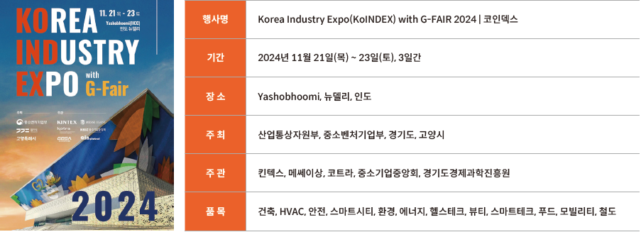 GMI 독자라면 다들 알고 계시겠지만, 이번 전시회는 KINTEX가 20년 운영권을 보유하고 있는 야소부미(Yashobhoomi, 구IICC) 전시장에서 한국 주최사가 개최하는 최초 전시회이다. 야소부미 전시장 운영권을 획득한 첫해부터 인도시장 진출에 대한 기대가 컸고, 산업자원부 등에서도 좋은 기회를 어떻게 활용할지 고민을 많이 해온 것으로 알고 있다. 2023년 가을에 뉴델리에서 개최된 G20 Summit의 일부행사가 개최되면서 개장하였고, 이후 지난 1년 동안 다양한 전시, 컨벤션, 이벤트가 개최되었다. 본격적인 한국 전시회의 서막을 알리기 위해 여러 기관이 협력하여 만든 KoINDEX는 남아시아를 넘어 중동, 아프리카까지 진출할 수 있는 신흥국의 스프링보드이자 전략적 허브, 세계 경제의 새로운 성장 엔진인 ‘인도’시장을 겨냥하는 플랫폼으로 기획되었다.