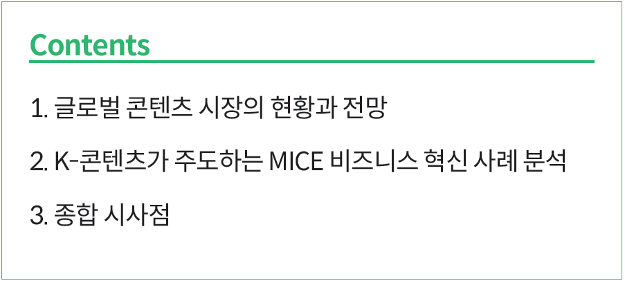 국내 MICE 업계에서도 이러한 시장 변화에 발맞춰 콘텐츠 비즈니스 모델을 적극적으로 도입해야 한다는 전문가 의견이 속출하고 있다. 글로벌 시장에서 K-콘텐츠가 주목받고 있는 현재, 영향력 있는 킬러 콘텐츠를 중심으로 MICE 브랜드 경쟁력을 강화하고, 참가자 경험 가치를 증진하는 산업 고도화 전략이 필요하다는 것이다.